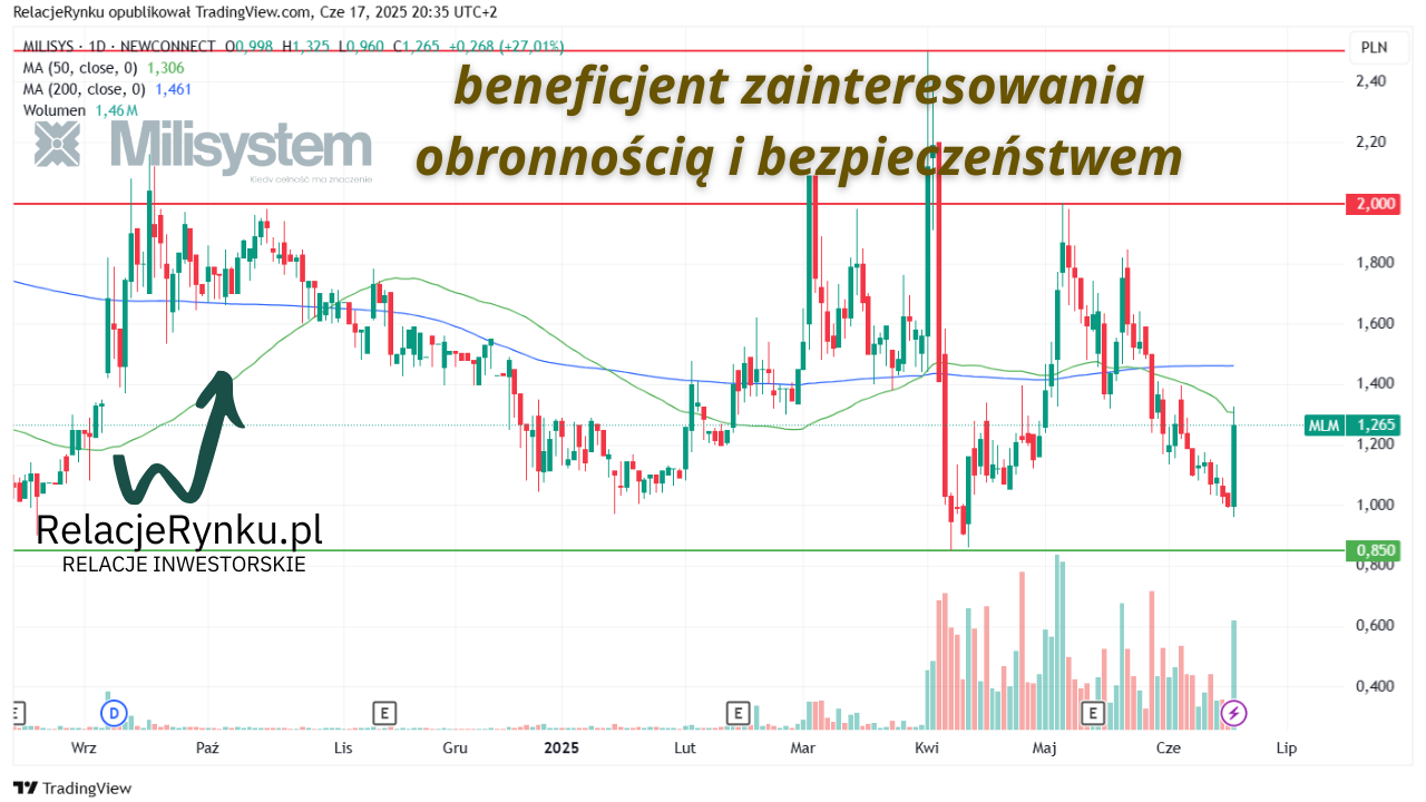 Jeszcze na pod koniec stycznia br. kurs giełdowy Milisystem oscylował na poziomie ok. 1 zł, rosnąc powoli w kolejnych tygodniach najpierw do poziomu 1,2 zł, a następnie 1,3 zł. Mocniejsze wybicie nastąpiło pod koniec lutego, gdy spółka poinformowała o zawarciu istotnej współpracy technologicznej z podmiotem z branży, której celem jest stworzenie jednego i zintegrowanego systemu trenażera laserowego, a następnie jego wspólny rozwój i dystrybucja. W efekcie obserwowaliśmy zwiększone zainteresowanie rynkowe walorami Milisystem, a notowania giełdowe w kilka sesji poszybowały z poziomu ok. 1,3 zł na ponad 2 zł za jedną akcję. W następnych tygodniach nastąpiła korekta i powrót w okolice 1,4 zł. Kolejny mocniejszy impuls wzrostowy nastąpił 1 kwietnia br., gdy firma technologiczna z rynku NewConnect poinformowała o uzgodnionym Memorandum Inwestycyjnym z partnerem z branży militarnej, na mocy którego Milisystem zostanie inwestorem kapitałowym w sektorze produkcji amunicji małokalibrowej. Informacja przełożyła się na potężny wzrost kursu giełdowego do poziomu 2,5 zł. Od tego momentu obserwowaliśmy wyraźnie zwiększone obroty sesyjne, które przełożyły się również na przetasowania poziomów zaangażowania kapitałowego poszczególnych akcjonariuszy. Część inwestorów wykorzystała wzrost zainteresowania rynkowego do realizacji zysków, co spowodowało spadek notowań ponownie w okolice 1 zł, a następnie stopniowe wzrosty i osiągnięcie 2 zł za jedną akcję. Przez ostatnie 1,5 miesiąca wyrysował się trend spadkowy na akcjach Milisystem, który przełożył się na ponowny retest cenowy na poziomie 1 zł i odbicie w górę w kierunku 1,2-1,3 zł.